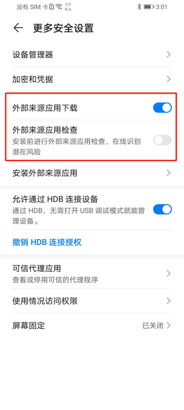2.开启“外部来源应用下载”,关闭“外部来源应用检查”